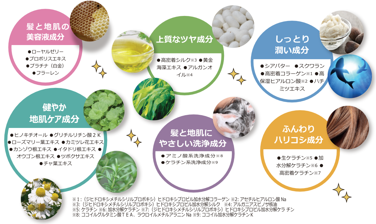 フェイシャル美容液レベルの処方で贅沢に配合した“高級美容成分”が、美しい髪と健やかな地肌をかなえます